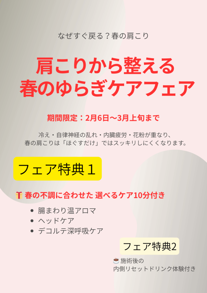 肩こりから全身を整える『春のゆらぎケアフェア』をご用意しました。