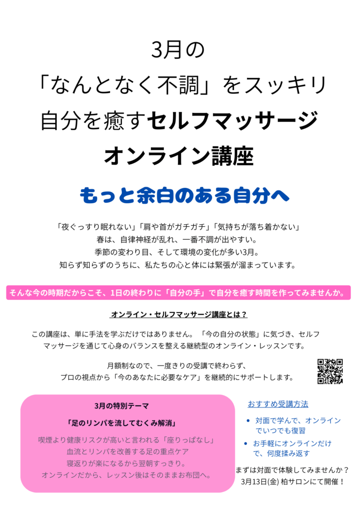 3月は変化の季節。 「なんとなく気分が乗らない」「体が重い」と感じる方も多いのではないでしょうか。私自身も、この時期は特に自分の体に触れて、心の余白を作る時間を大切にしています。