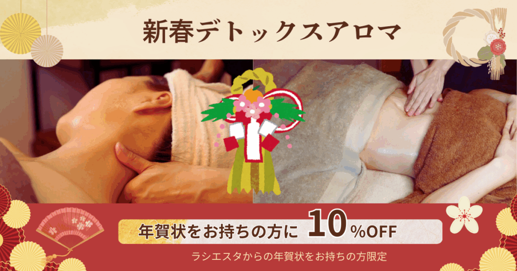 本特典は、「アロマテラピーサロンラシエスタ」の年賀状をご持参の方限定の特典です。